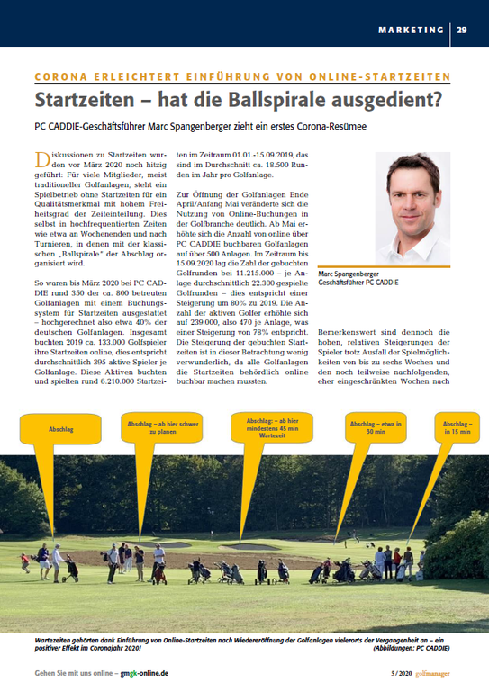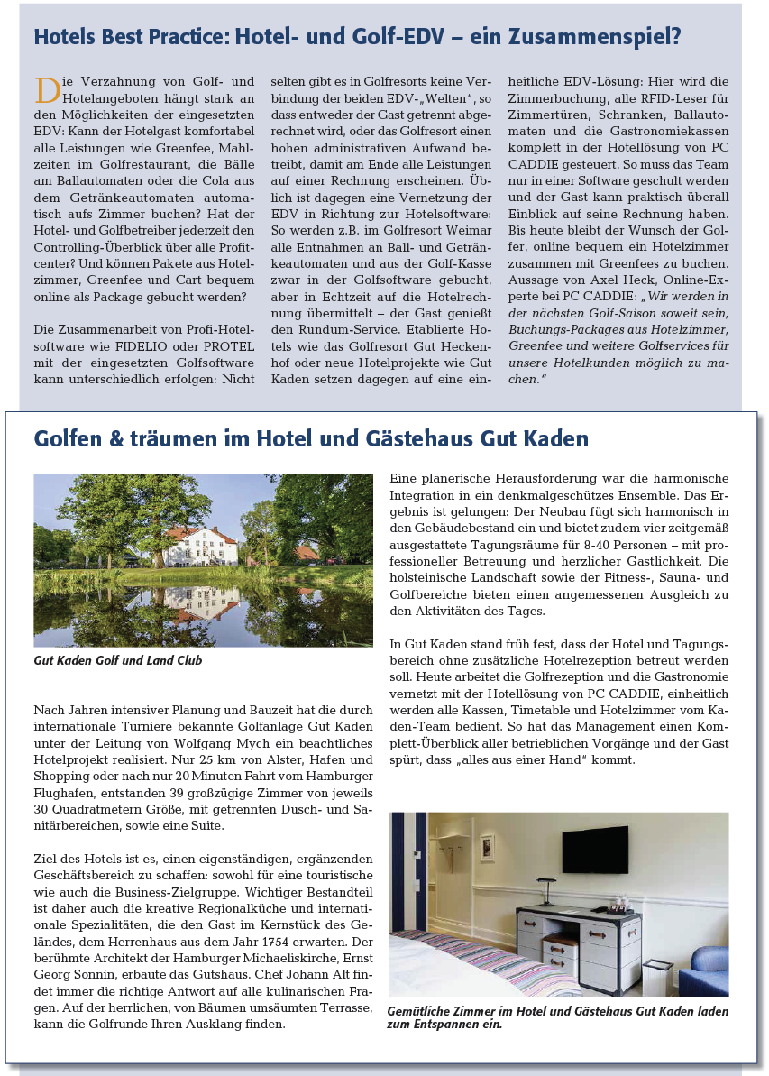 „Bei den Empfehlungen zu künftigen Greenfees bietet PC CADDIE den größten Systemumfang... Als einziger Anbieter unterstützt PC CADDIE nach den vorliegenden Informationen den Verkauf kompletter Leistungsbündel, also beispielsweise Greenfee plus Cart plus Leihschläger, zu einem Gesamtpreis... ein wichtiges und wirksames Instrument der Ertragsoptimierung, da der Kunde keine Einzelpreise mehr sieht... Darüber hinaus unterstützt PC CADDIE die meisten Serviceangebote der Clubs als optional zubuchbare Leistung...“ Weiter zum Artikel