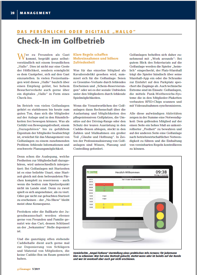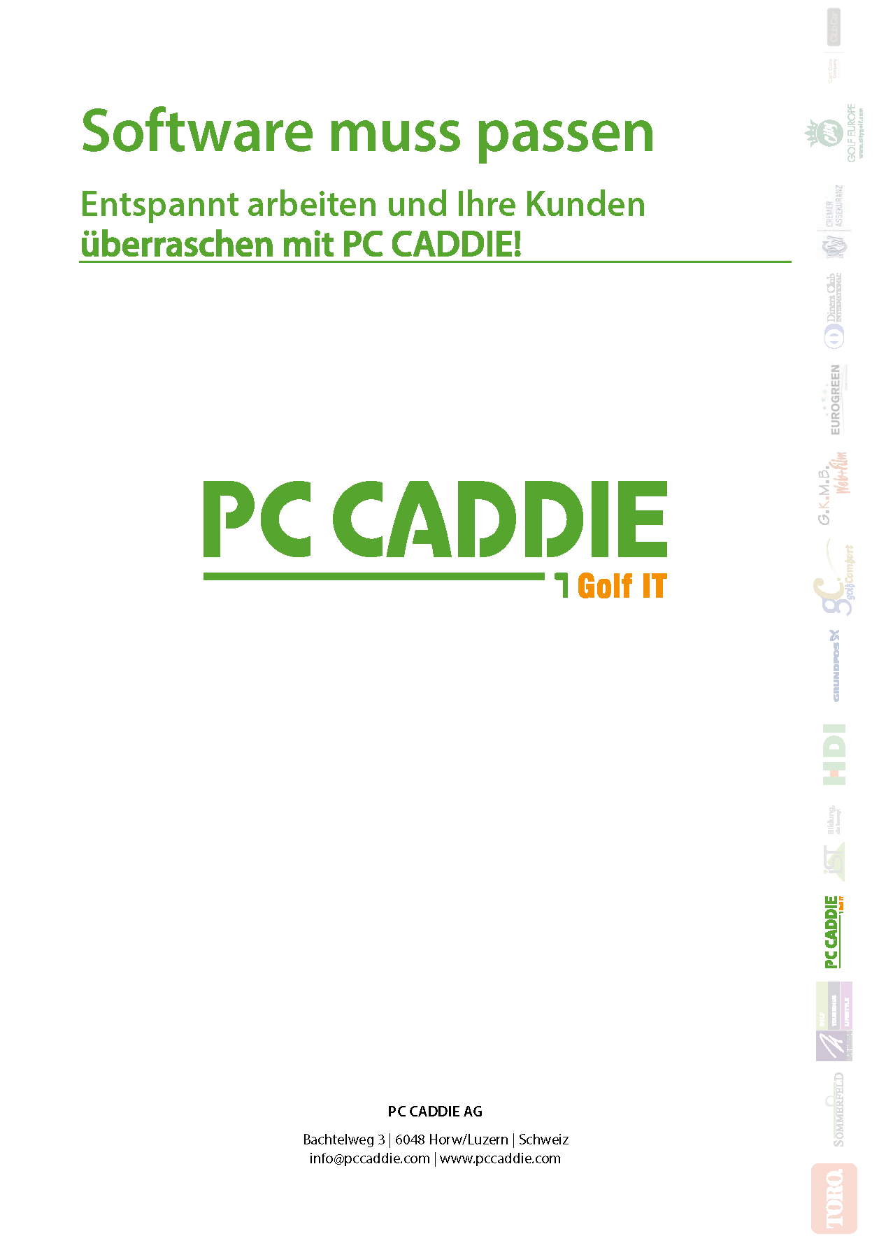 „PC CADDIE offers the largest scope regarding the recommendations for future green fees… As sole supplier, PC CADDIE supports the sale of complete green fee packages according to the available information, for example green fee plus cart plus rental clubs, at a total price of... an important and effective instrument for optimizing earnings, as the customer no longer sees individual prices... In addition, PC CADDIE supports most of the club's services as an optional service... “. Read the article in full