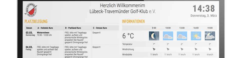 Alles auf einem Bildschirm: Platzinformationen, Turnierdaten, Start- und Ergebnislisten, das Wetter, aktuellste Nachrichten und Bilder - im Clubhaus oder am 1. Abschlag, überall dort, wo Sie es wünschen. Alles dargestellt in einem ansprechendem Format mit unserem PC CADDIE://online InfoScreen in FullHD, ob Indoor oder Outdoor - auch im Hochkant-Format: So sieht moderne Information für Ihre Kunden aus.